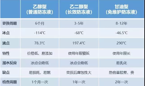 目前市面上的防冻液大致上可以分为三大类,乙醇型、乙二醇型、甘油型三种:由于三者间的化学性质和添加剂各不相同,所以在常规使用的寿命和更换周期上也有不同的时间。